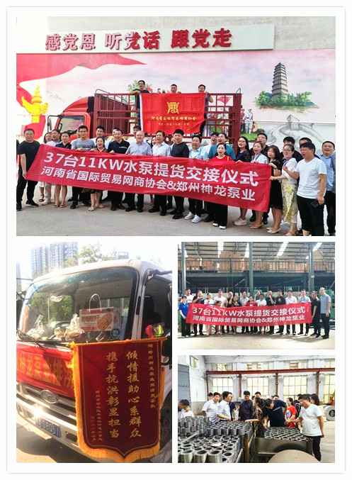 河南国际贸易网商协会、大连狄立空气净化器有限公司水泵提货交接,未来路街道赠神龙排涝突击队锦旗